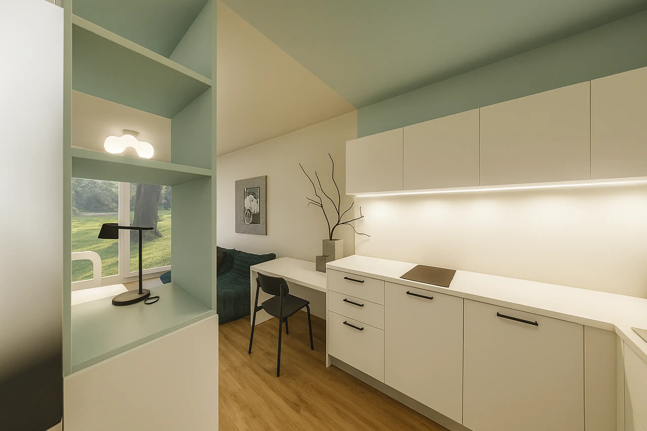 Dein möbliertes Apartment in Münster ist komplett ausgestattet: mit Bett, Arbeitsplatu, moderner Küche und stilvollem Interior. Hochwertige Materialien und ein durchdachtes Desgin sorgen dafür, dass du dich vom ersten Tag an zuhause fühlst.